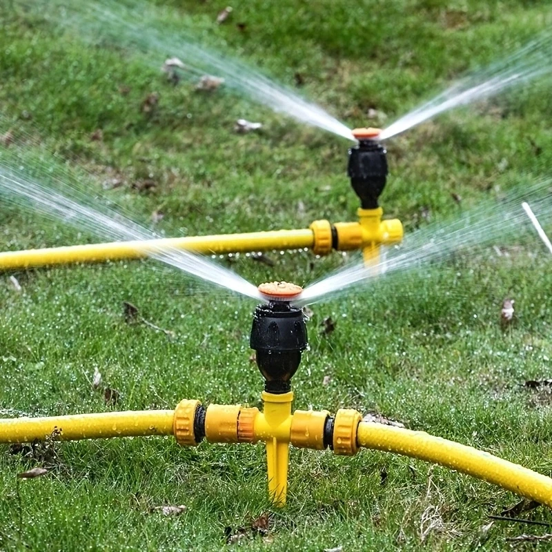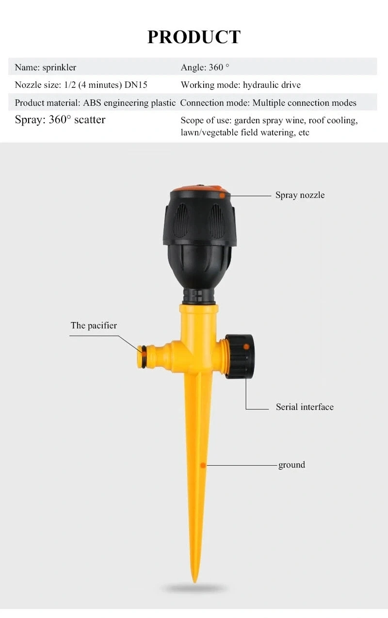 A compact, NEW "Automatic Rotating Sprinkler" designed for efficient and gentle "Garden Watering". This unit provides "360 Degree" water coverage and features a specialized spike base that allows it to be inserted into the ground or connected directly in-line with a "Hoses hose". It is highly versatile for "Gardening Irrigation", particularly for "Watering Flowers" and "Watering Vegetables".