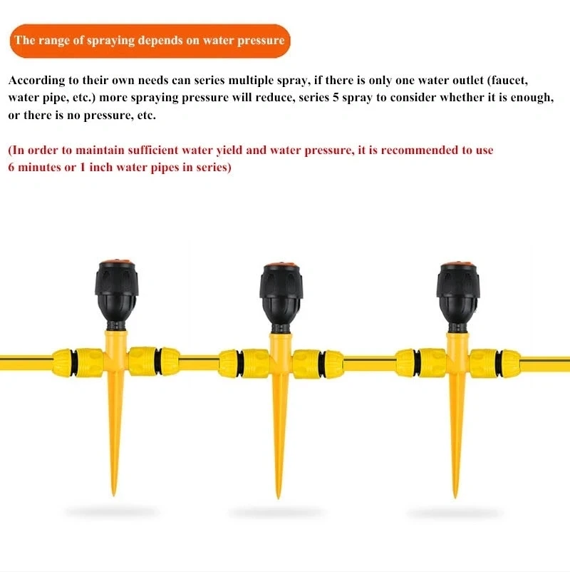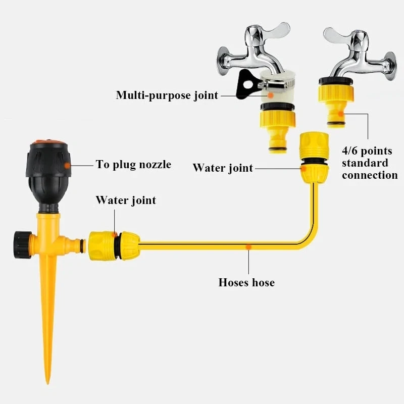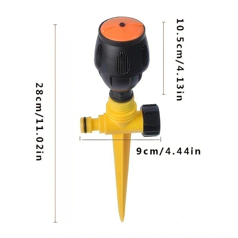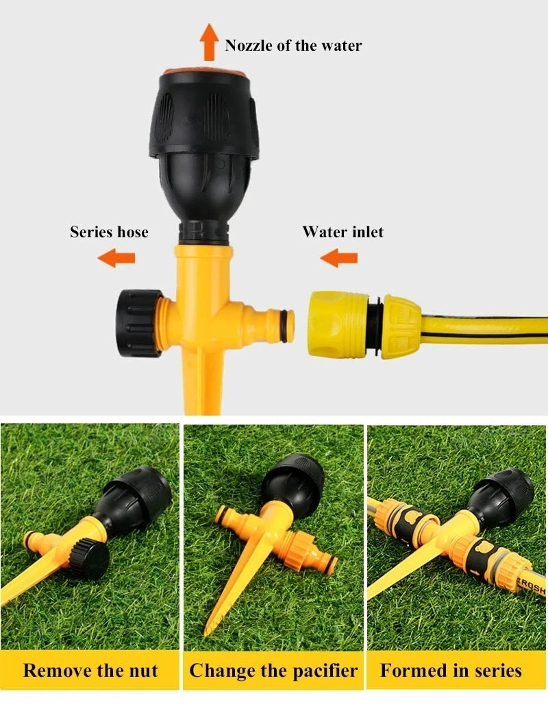 Functionality: Driven by water pressure, the black nozzle head rotates "360 Degree" to distribute water evenly. It can be connected to the end of a hose or used in-line via the side joint to connect multiple sprinklers.