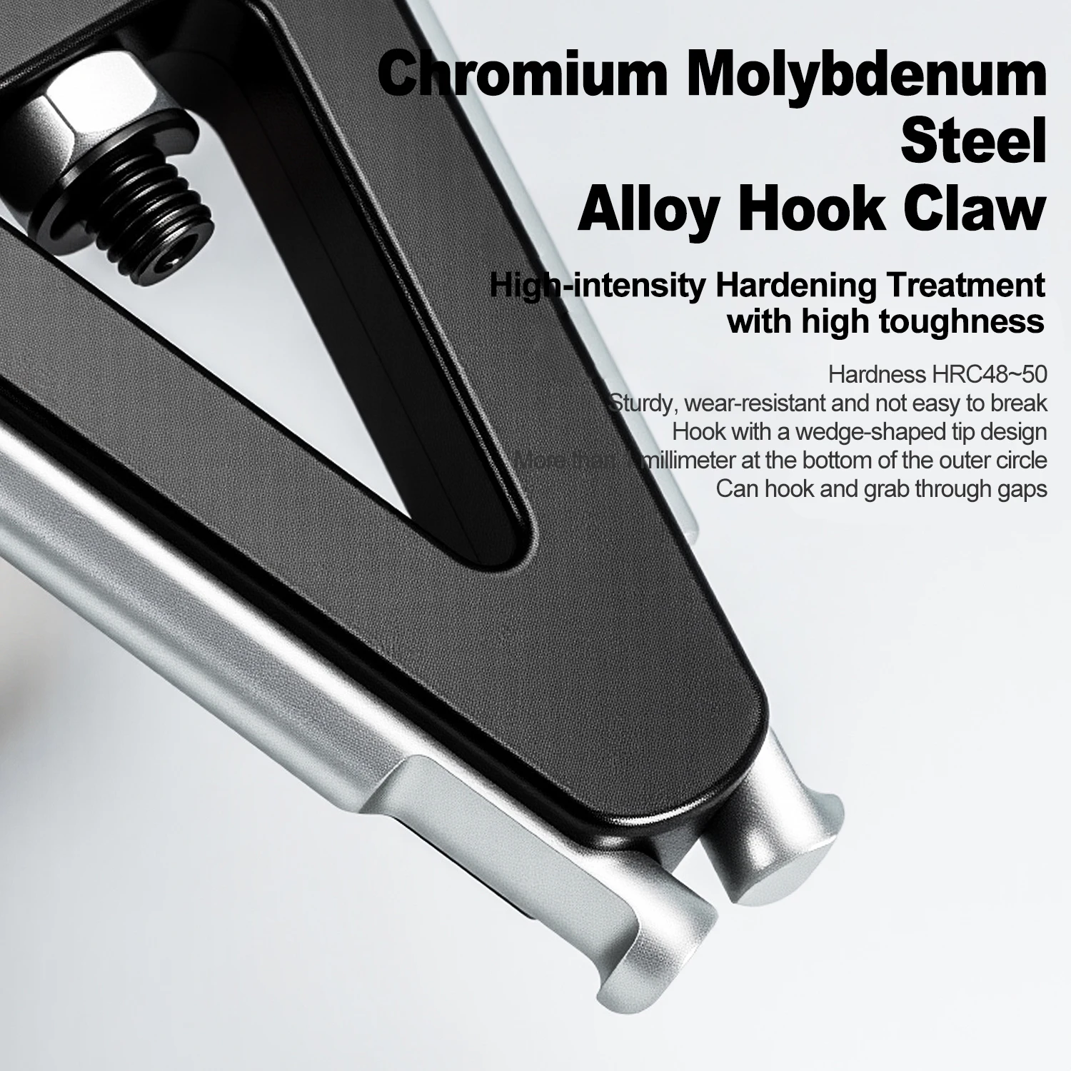 Material: Constructed from Chromium Molybdenum Steel Alloy, featuring high-intensity hardening treatment and high toughness. The wedge-shaped tip design allows it to hook and grab through narrow gaps.