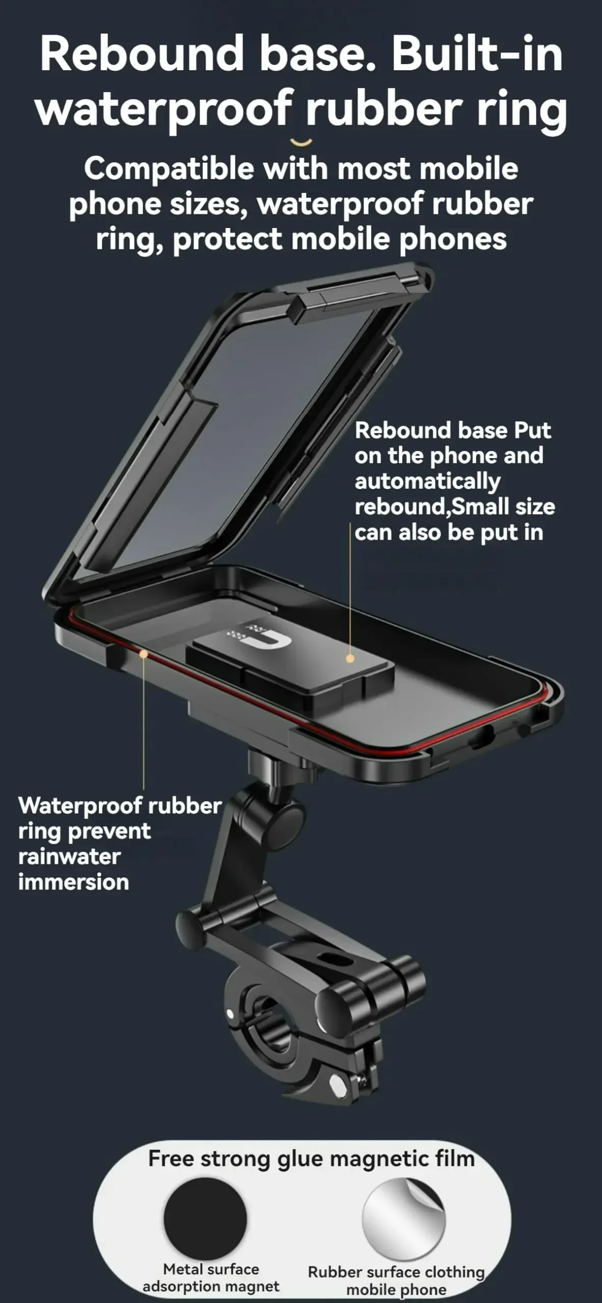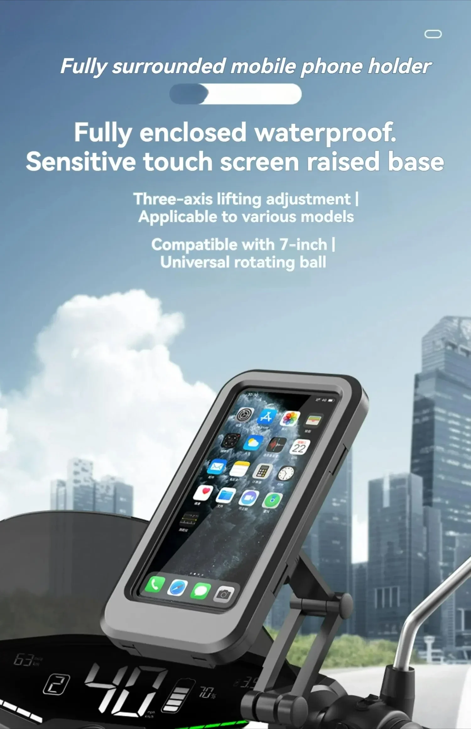 Featuring a waterproof protective case and a secure handlebar mount, it shields your phone from rain, splashes, mud, and dust while reducing vibration on rough terrain. The clear, touch-sensitive screen window allows easy operation without removing your phone, keeping your focus on the ride.
