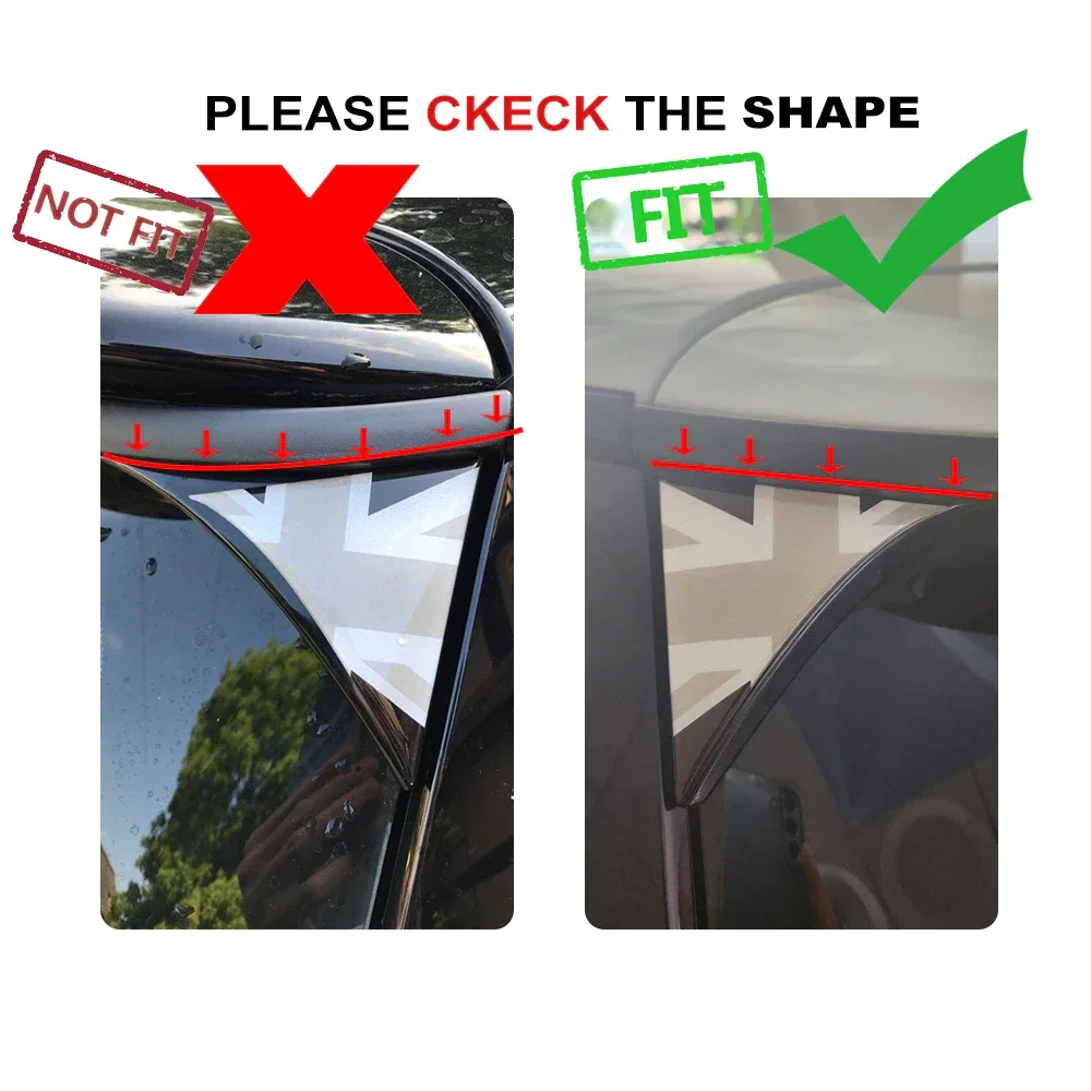 This product is a set of triangular Vinyl Decals designed to cover the rear window corner trim of specific vehicles (commonly hatchbacks like the Mini Cooper). The decals offer various patriotic or racing-themed patterns, including the Union Jack (UK Flag) and Checkered Flag designs.