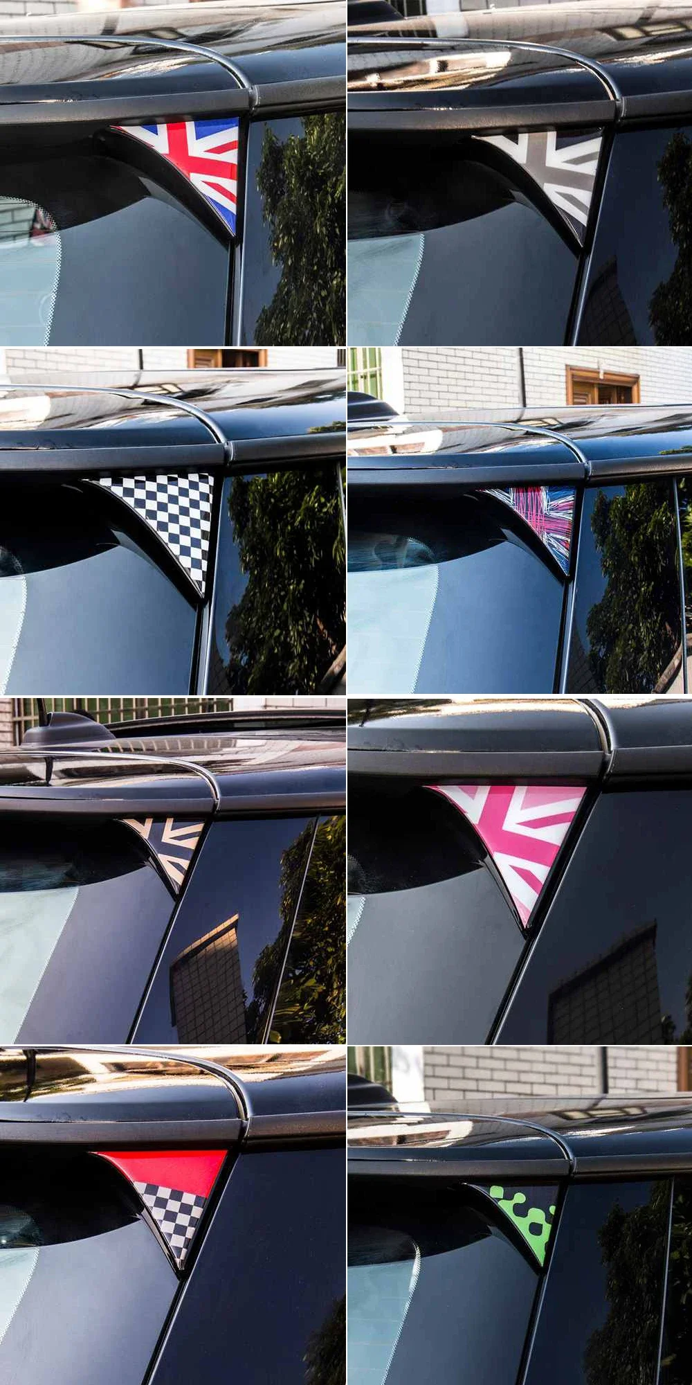Design & Detail: Small, precisely cut triangular decals shaped to fit the lower corner trim piece of the rear window (C-pillar area). The primary designs shown are a distressed Union Jack and a Pink or Red Checkered Flag pattern.