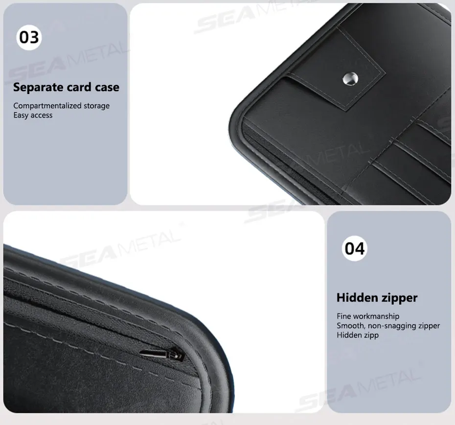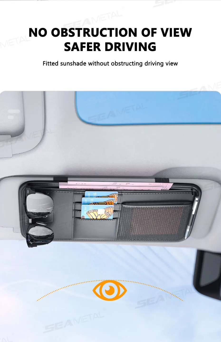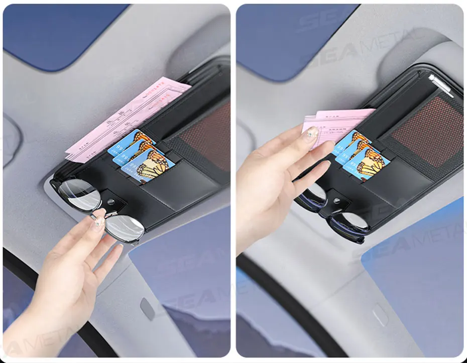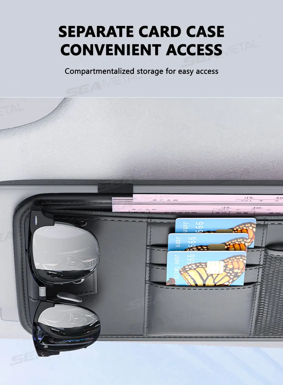 This product is a flat, multi-pocket organizer designed to attach securely to the vehicle's sun visor. It is intended to provide "Extended storage space for daily needs" while ensuring "Convenient storage, beautiful and styling".