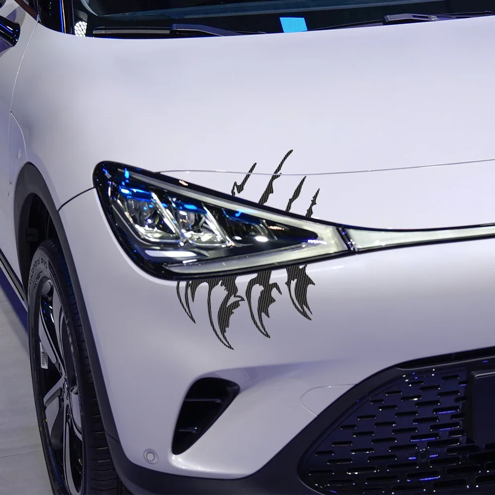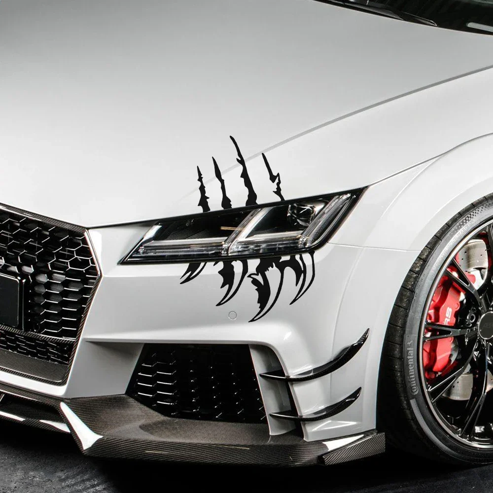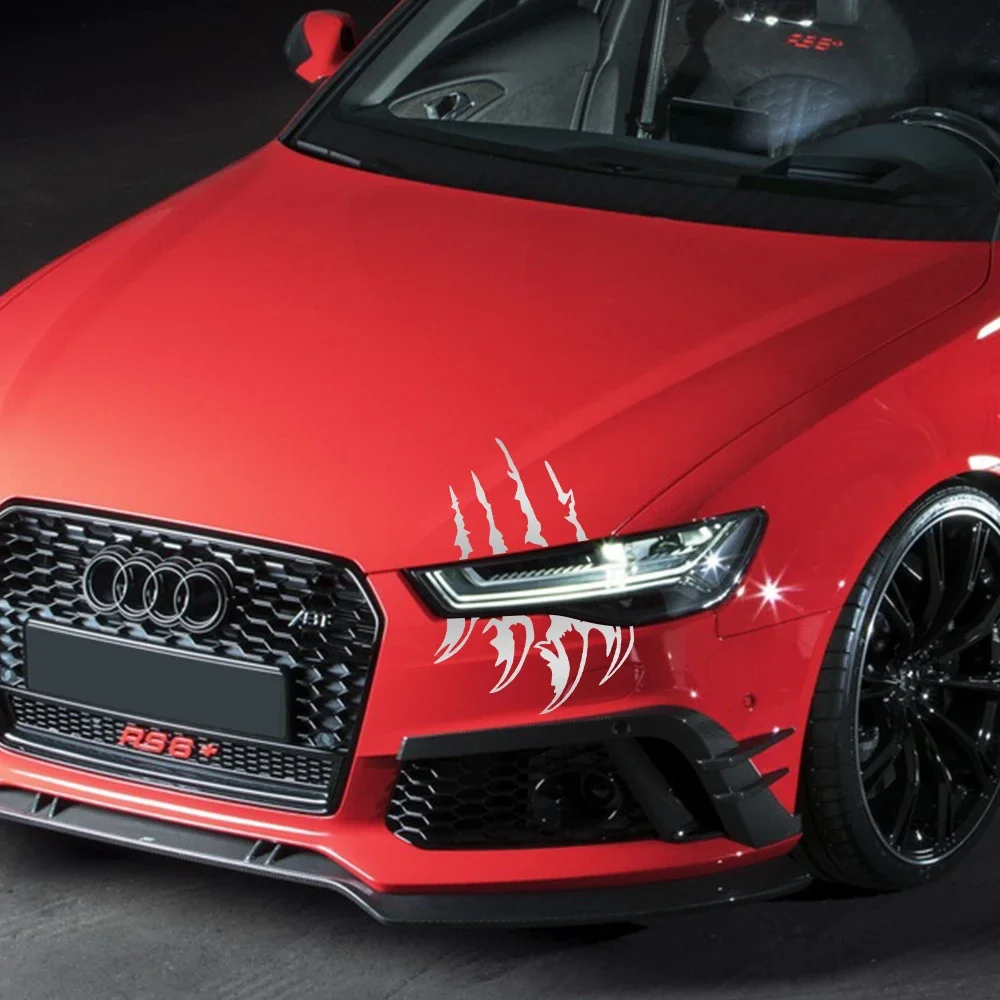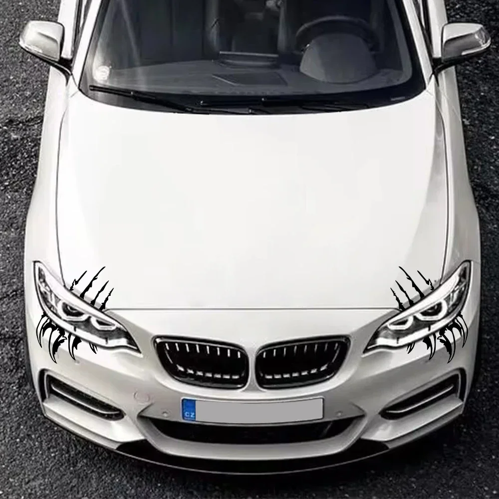 These sharp claw decals are a simple, high-impact method of vehicle customization, instantly transforming the car's front fascia with an aggressive, predatory look. The durable vinyl ensures the graphic maintains its sharp detail against the elements, making it an excellent, non-permanent accessory for tuning enthusiasts looking for a bold statement.