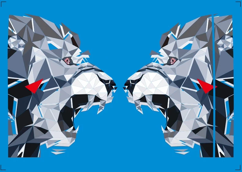 Design & Theme: Features a complex, geometric/polygonal style graphic of a fierce animal head (often appearing as a lion or wolf). The design incorporates sharp lines and contrasting colors (white, blue, black, red) to create a bold, modern, and aggressive look.