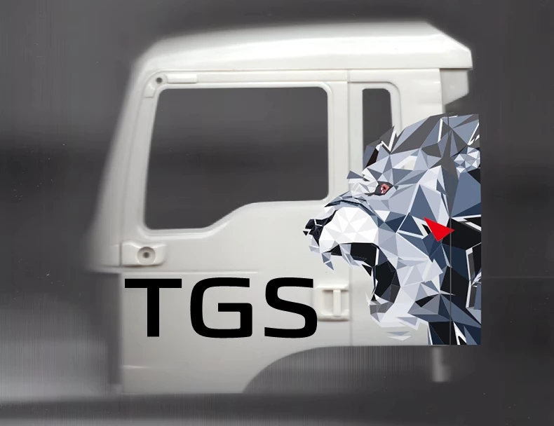 This is a specialized, multi-piece vinyl decal kit featuring a modern, geometric graphic of a lion or wolf head. It is specifically designed and sized for 1/14 scale Tamiya RC Truck, Trailer, Tipper, and MAN TGX TGS models. It serves as a striking visual upgrade for RC DIY and tuning projects.