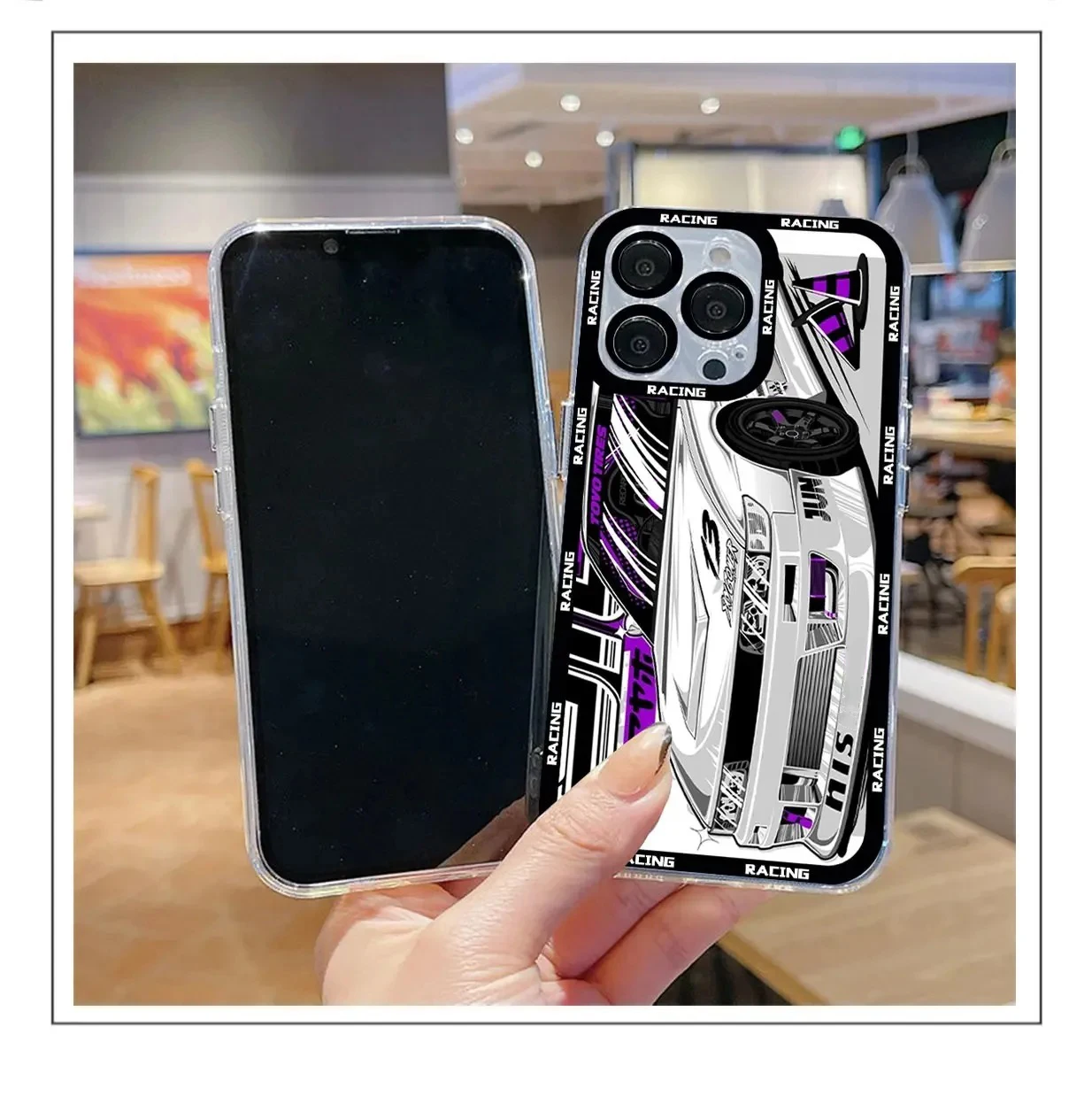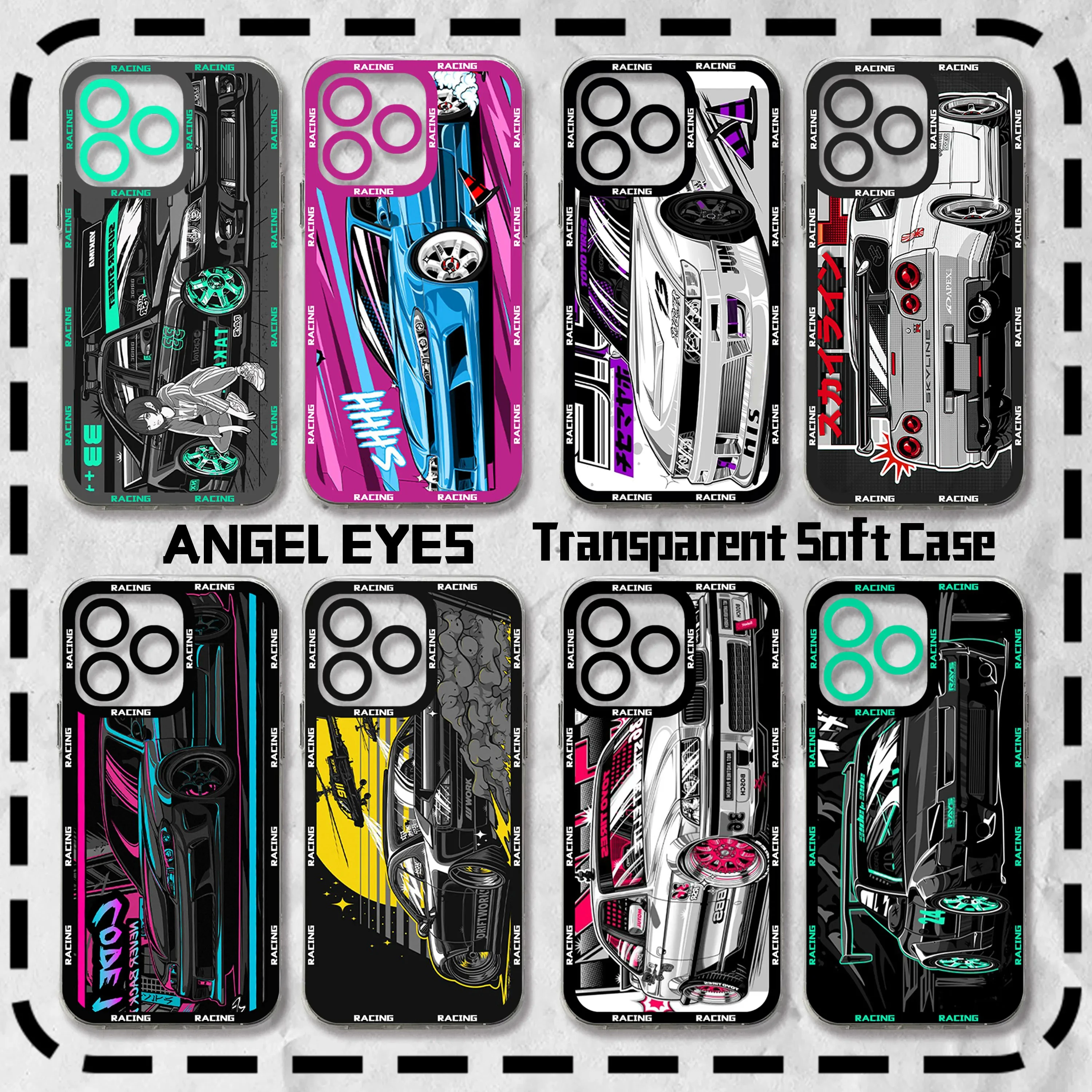 These Transparent Neon Racing Graphic Phone Cases are the ultimate expression of JDM and street racing style. Featuring complex, multi-layered graphics of tuner cars with vibrant neon accents (pink, cyan, yellow), the transparent case allows the artwork to truly pop. Made from flexible TPU, it provides excellent grip and protection while delivering a bold, customized aesthetic.