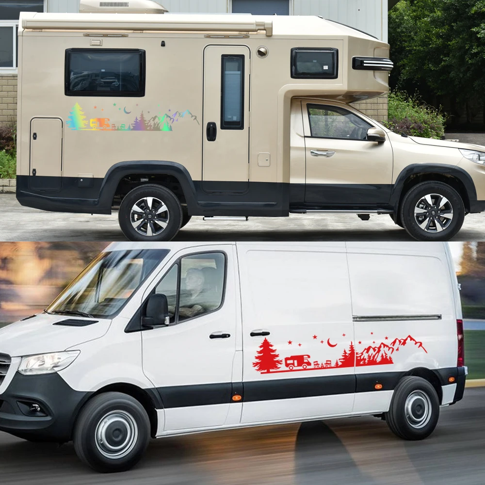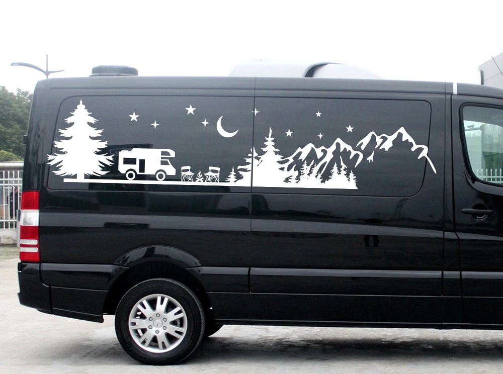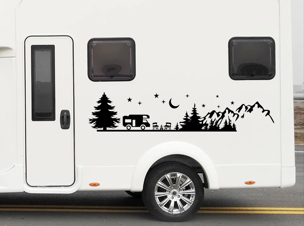 This expansive graphic decal features a picturesque silhouette of a campsite nestled within a mountain and forest landscape under a starlit sky. It's the ultimate custom accessory for drivers who want to project a clear message of adventure, rugged travel, and the freedom of off-grid exploration onto their vehicle.