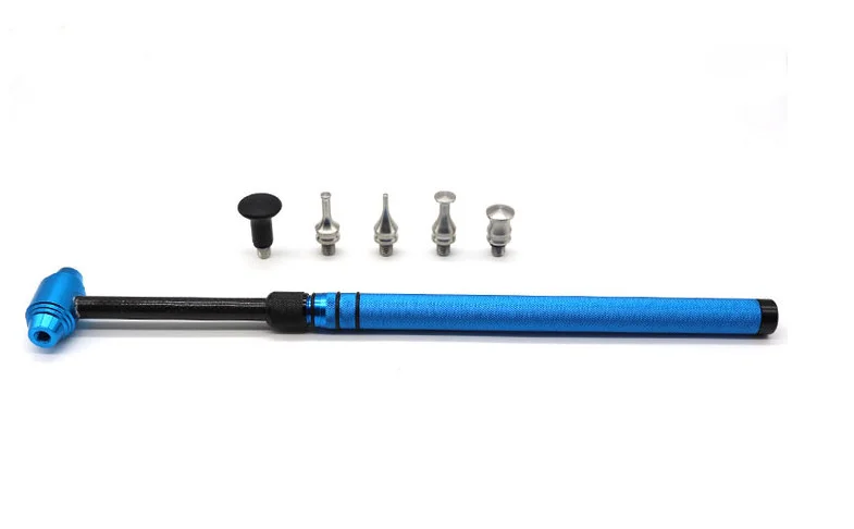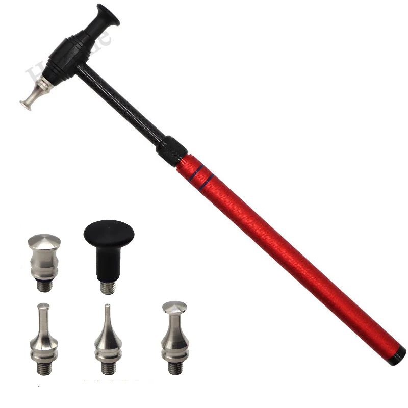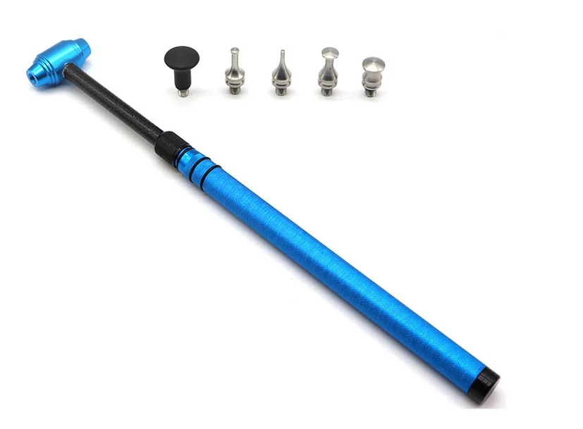 Design & Detail: A main adjustable T-bar hammer tool constructed from lightweight, anodized aluminum (often blue and red) with a textured handle grip. The hammer acts as a slide hammer for controlled pulling action. The set includes multiple, interchangeable metal and plastic tips of varying shapes (flat, pointed, blunt).