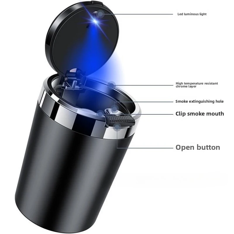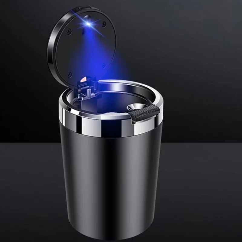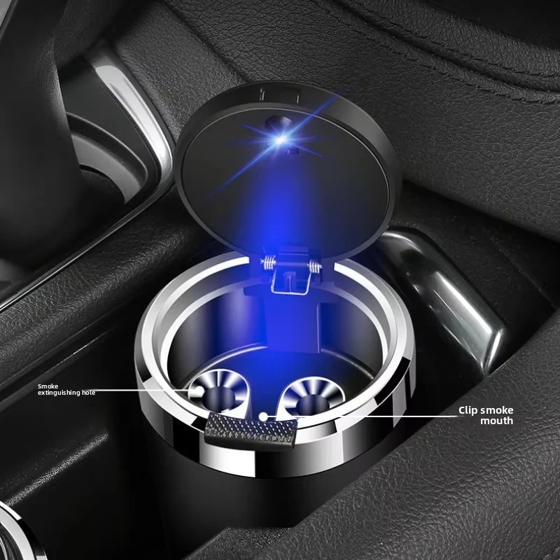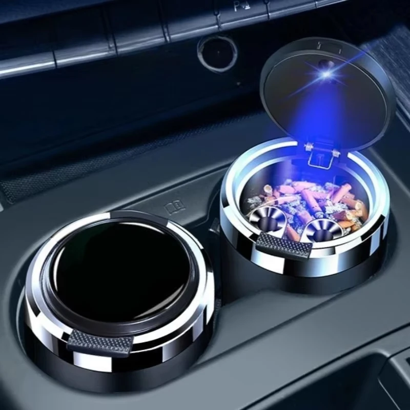 A premium, portable ashtray designed to fit perfectly into a car's standard cup holder. This essential accessory features a sealed, tight-fitting lid to effectively lock in smoke and odors, ensuring a fresh and clean car interior. A built-in blue LED light automatically illuminates the container when the lid is opened, allowing for safe and easy use at night. It is constructed with a durable, fireproof material and includes a convenient internal rest for cigarettes.