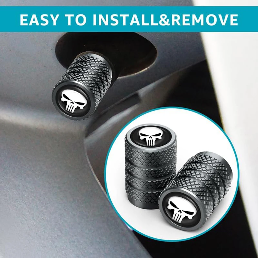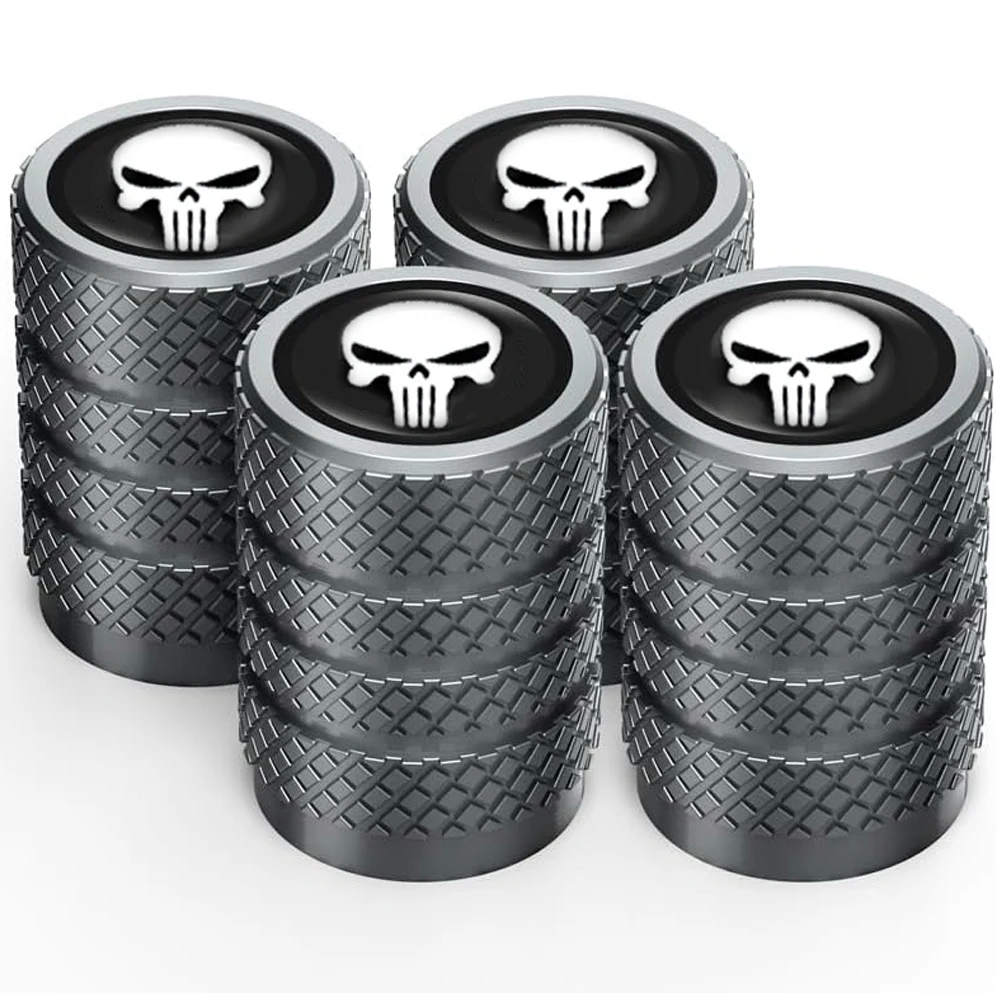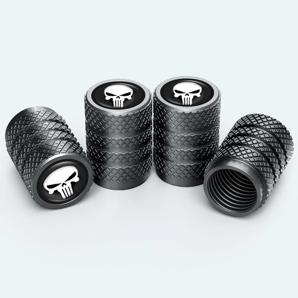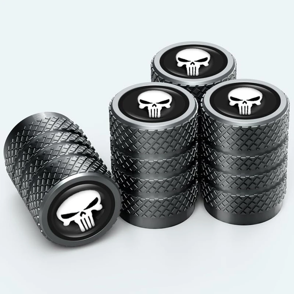 A distinctive set of four decorative valve stem caps featuring the iconic "Punisher Skull" motif on the cap face. Crafted from durable metal, these caps provide essential protection for the valve core against dust, dirt, and moisture while delivering a bold, customized aesthetic to the vehicle's wheels. The body of the cap is typically finished with a rugged, textured (knurled or mesh) pattern for a secure grip and robust look, appealing to enthusiasts of the military/vigilante theme.