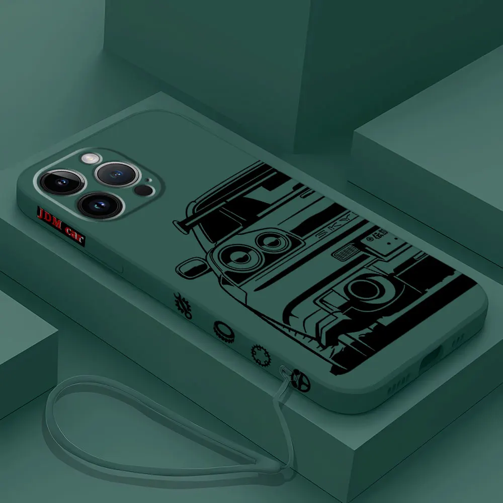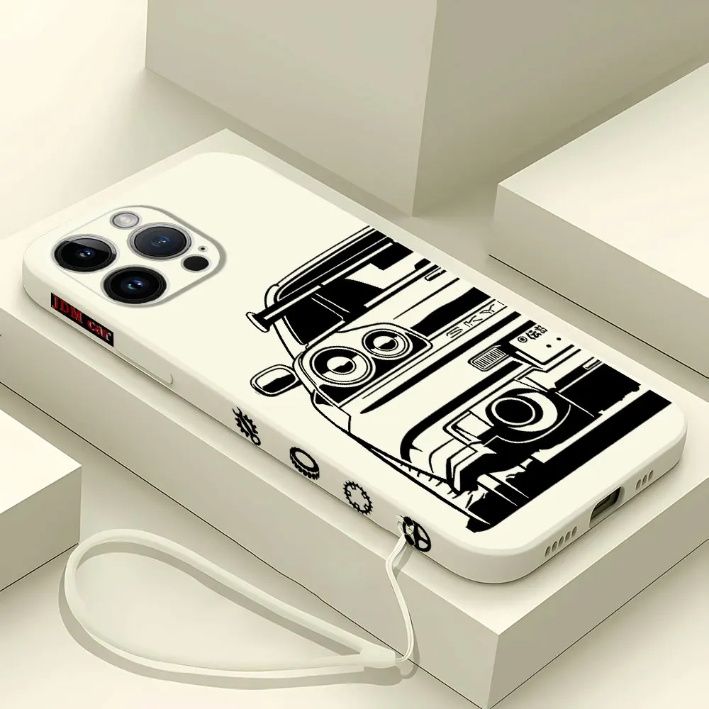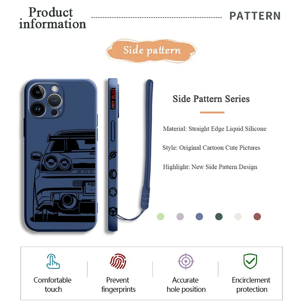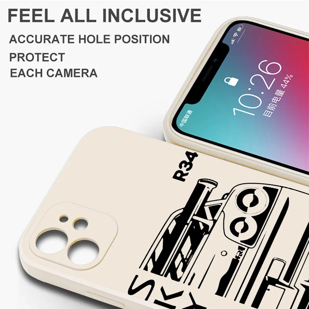 The R34 Graphic Phone Case is the perfect blend of protection and personal style. Its durable liquid silicone material safeguards your phone from daily bumps and scratches, while the classic straight-edge design and the striking R34 graphic make a bold statement. The included lanyard ensures your device is always secure, making it an ideal accessory for car lovers who want to showcase their enthusiasm.