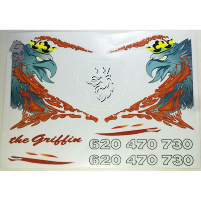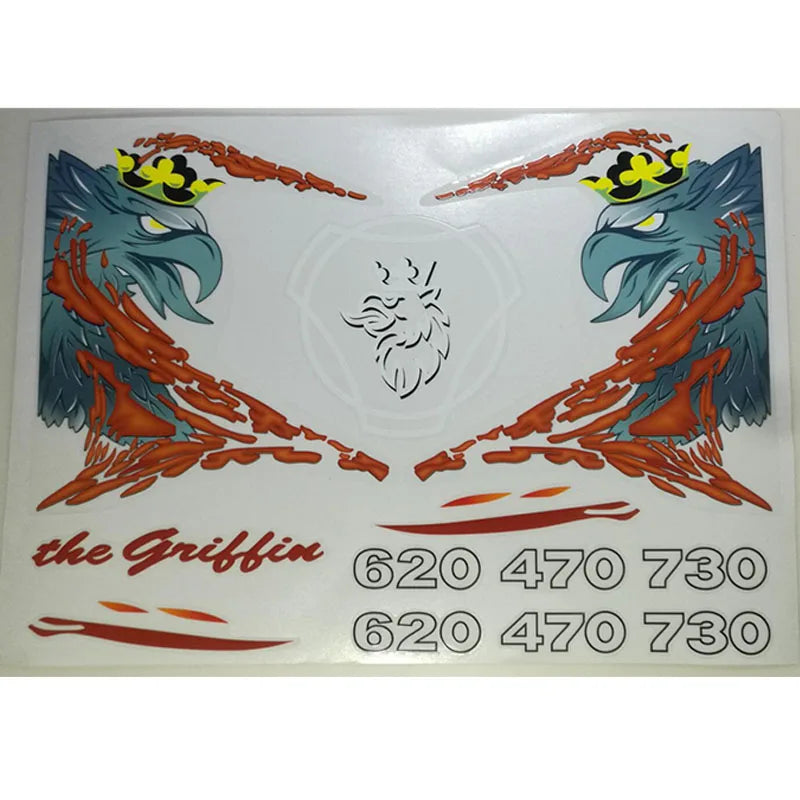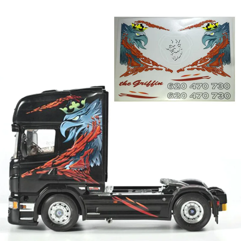 This is a premium, multi-piece vinyl decal kit featuring a large, intricate griffin or eagle graphic, often referred to as the "Red Eagle Knife" sticker. It is precisely designed for the 1/14 scale Tamiya RC Truck, Trailer, Tipper, specifically for Scania R470, 620, 770s, and R730 models. The kit also includes additional graphics like the "the griffin" text and numbers (620 470 730).