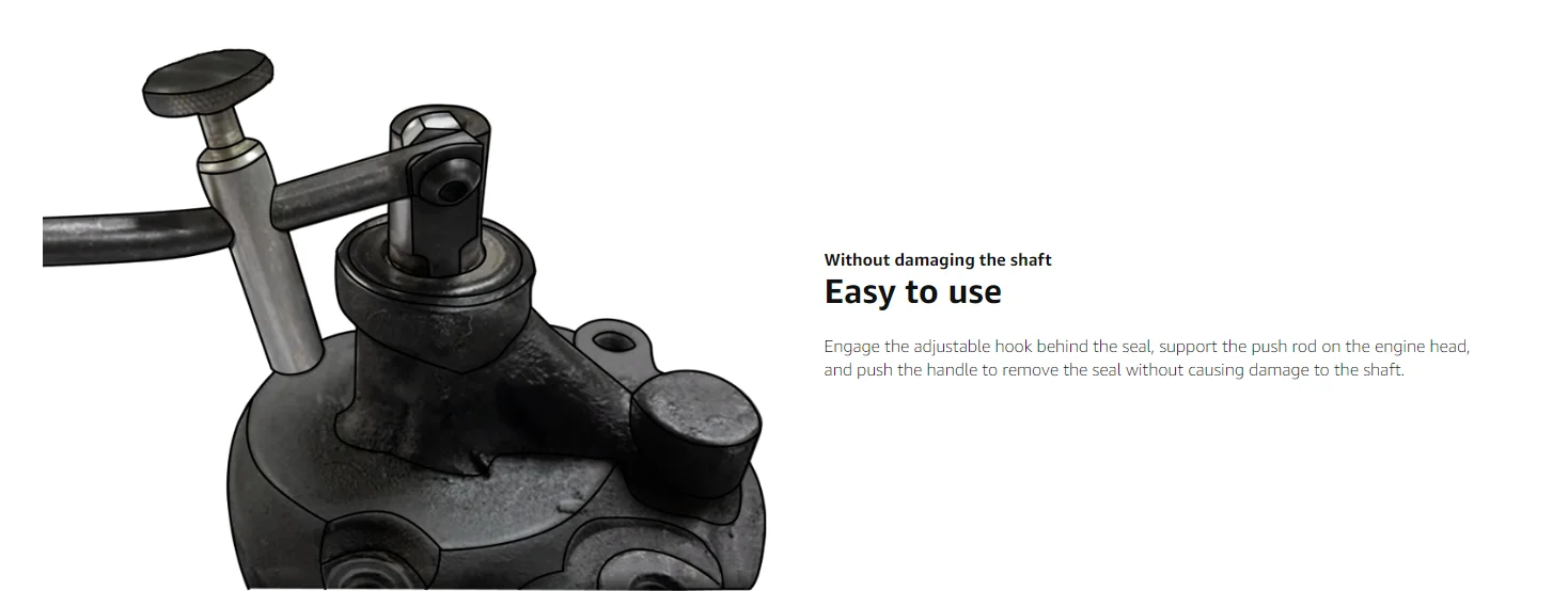 Easy Operation: Engage the adjustable hook behind the seal, support the push rod on the engine head, and push the handle to remove the seal without causing damage to the shaft.