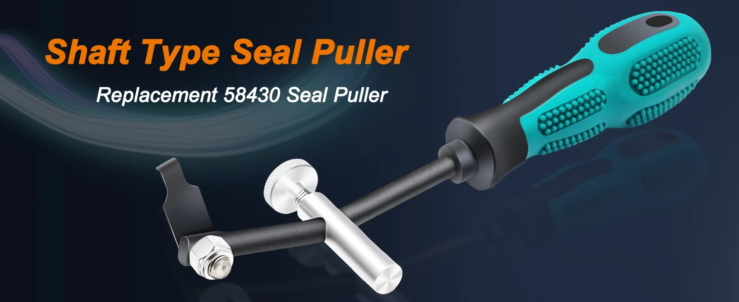 Style: Described as a heavy-duty specialty puller, it is designed to replace standard seal removal methods like the 58430 model. The overall aesthetic is Professional and Technical.