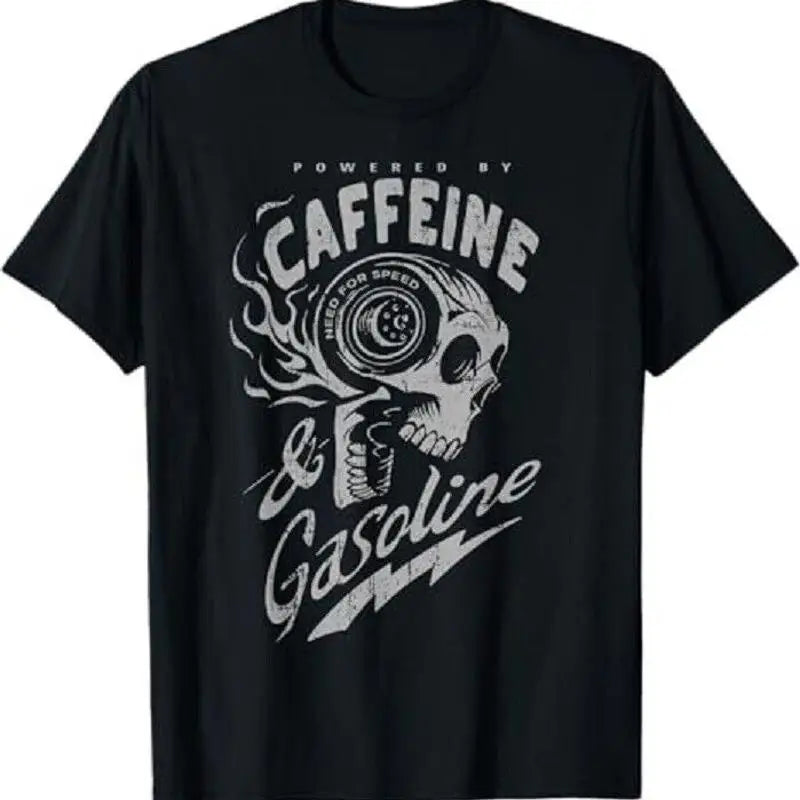 ✔ Skull graphic with “Caffeine & Gasoline” biker slogan