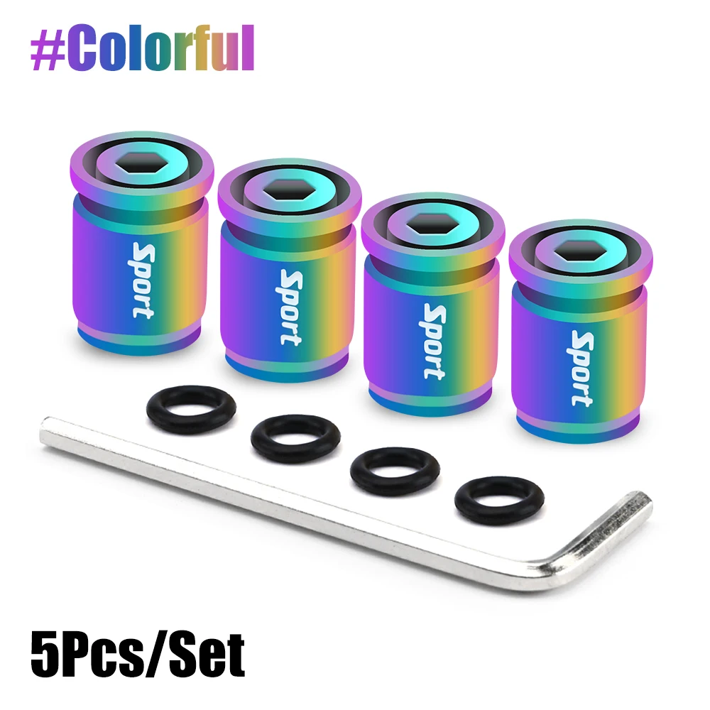 A premium set of protective valve stem caps featuring a dual-layer security design: an external "Anti-theft design" requiring a specialized wrench (included) for installation/removal, and an internal "Rubber O-Ring Protection". These features ensure a superior seal and protection against air leakage, dirt, water, and corrosion. Available in multiple colors/finishes, including Chrome, Black, Gold, and a unique Rainbow (Neo-Chrome) finish.